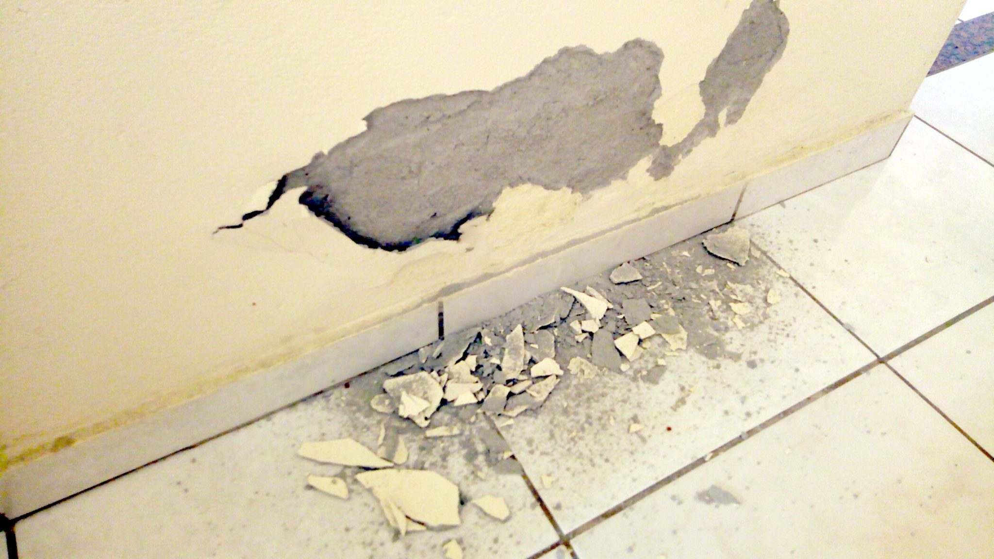 - O muro externo está rachado grosseiramente bem ao meio e um dos extremos desse muro cedeu e está desmoronando.